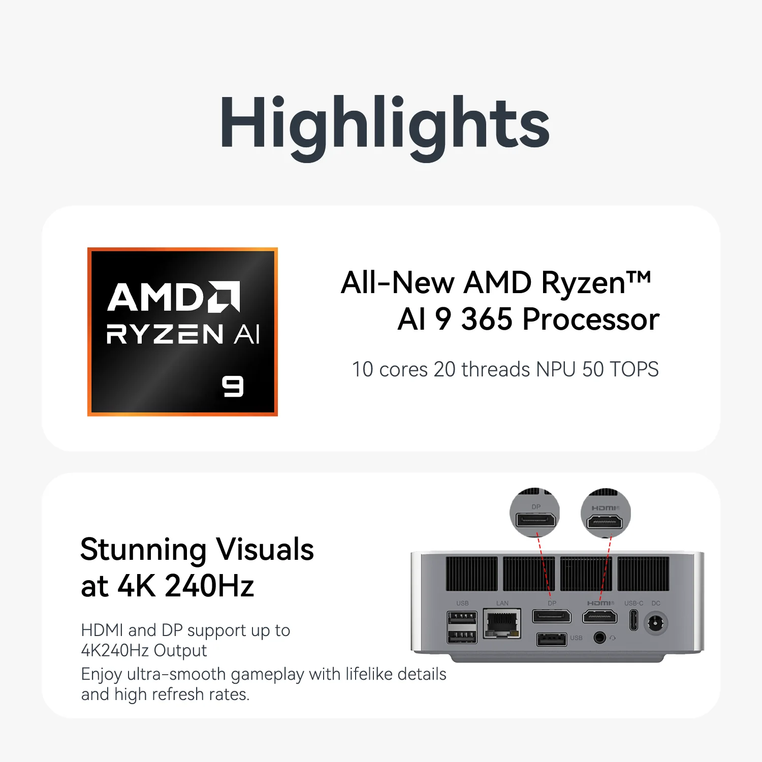 - 🏆【Powerful AMD Ryzen™ Al 9 365 CPU and AMD Radeon™ 880M GPU bring the Future to your Fingertips】---With CPU, GPU, and NPU on one chip, the brand-new architecture design of the AMD Ryzen™ Al 9 365 chipset significantly boosts the SER9 Pro's core count and overall performance, delivering a faster, smarter, and more secure Al PC experience.